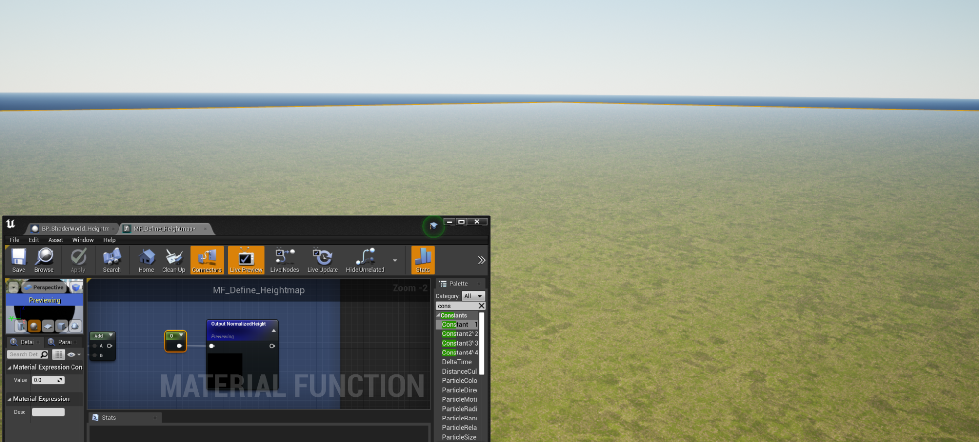 To visualize its effect, first select the terrain in your currently opened demo map (Blank demo map is a good starting point), and check **Update Height Data Over** time in its detail panel **Config** tab: this option is used to create oceans, but allows instant feedback when iterating on landscapes. Open the *MF\_Define\_*\* Material Function associated with your current world, now updating every frame, and replace the current computation by a simple constant to the output pin, compile the material function and observe the result.
