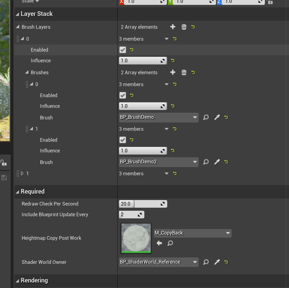&#x20;       Blueprint workload being performance intensive, the blueprint implementable functions will only be called once every IncludeBlueprintUpdateEvery update of the layer stack. Preferably, Blueprints should rarely update parameters outside of the context of modeling the landscape in Editor. If a given brush has to update parameters regularly, it’s recommended to create it using c++ by inheriting the AShaderWorldBrush class and overriding ApplyBrushAt and Reset functions.
