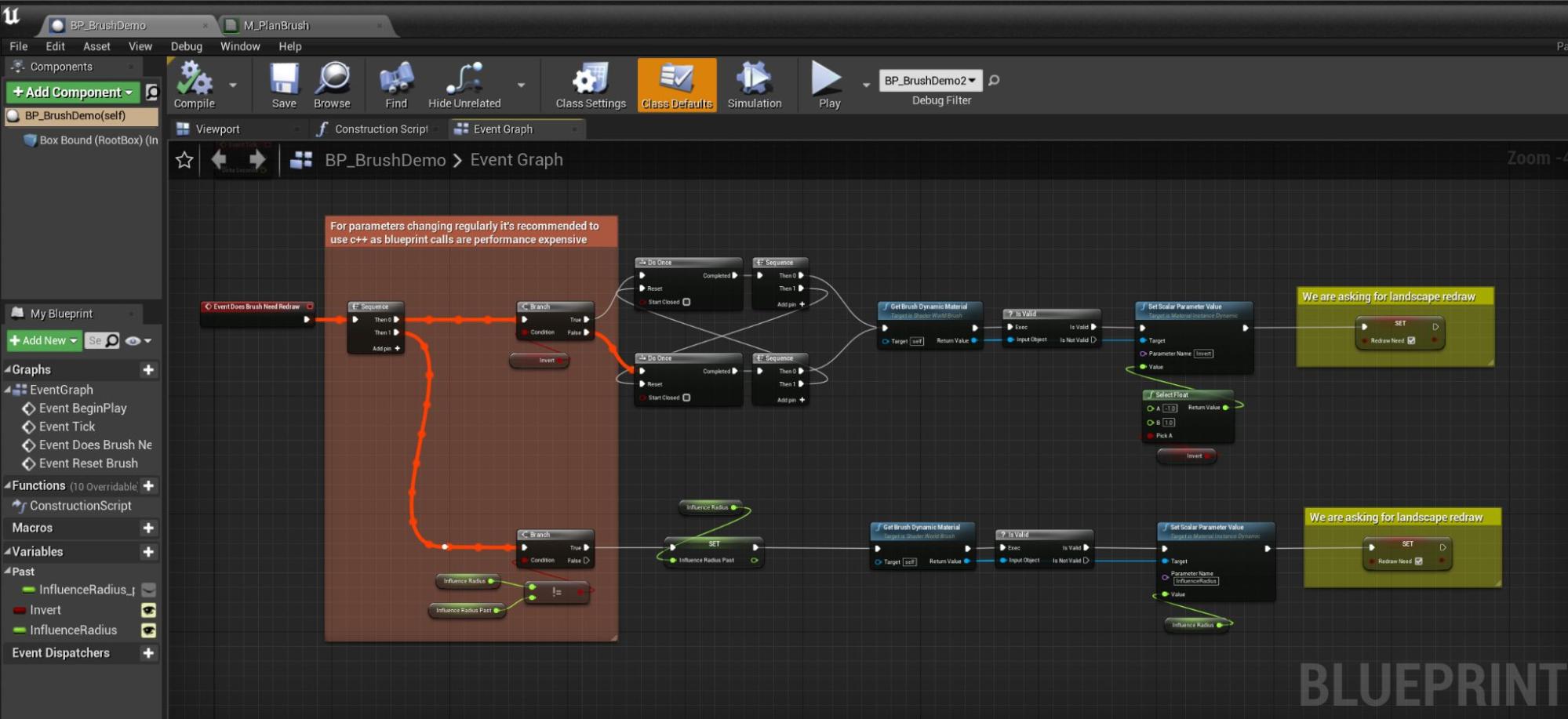 <figure><img src="https://1959481941-files.gitbook.io/~/files/v0/b/gitbook-x-prod.appspot.com/o/spaces%2FoSgK3bK748KQ9bA59ss4%2Fuploads%2FkpDBLwBhTMmYLJGSjHBa%2Fimage21.jpg?alt=media" alt=""><figcaption><p>BP_BrushDemo updating parameters of its dynamic material from blueprint</p></figcaption></figure>