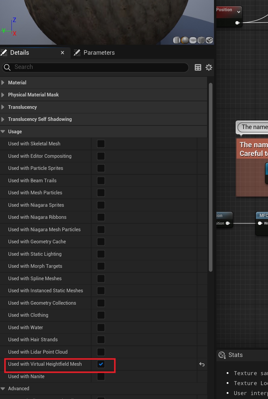 Inside your surface material, *not the generator material* but the material being applied to the generated surface, be sure to toggle **Used with Virtual Heighfield Mesh** within its detail panel. By making this simple switch mandatory, we prevent unecessary shader compilation when you're enabling the plugin.